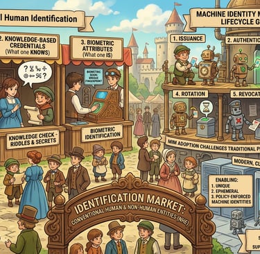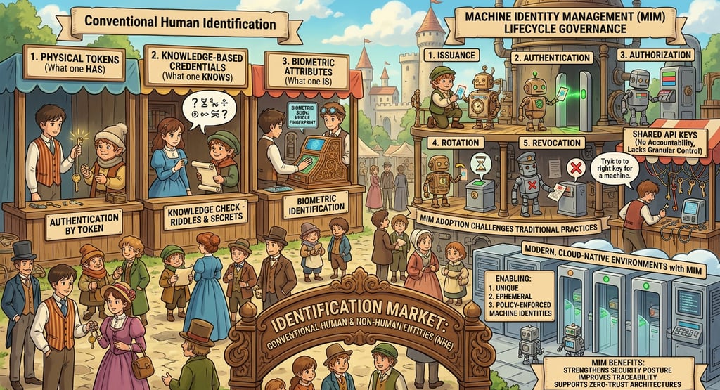 The identification of NHEs requires a sophisticated framework that diverges from traditional human authentication protocols. In contrast to conventional human identification mechanisms—such as physical tokens (what one has), knowledge-based credentials (what one knows), and biometric attributes (what one is) — Machine Identity Management (MIM) functions within a highly automated and distributed digital ecosystem where non-human entities require secure and scalable identity controls.
